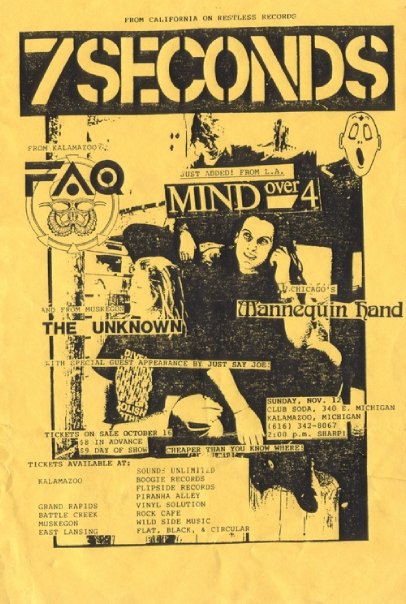 One might look at this and think "sweet, 7 Seconds rock", and then think "cool, we'll get to see FAQ too, what a perfect match-up", and the real treat is to scroll down in the little handwriting and know, that if you were to show up at 11 AM, you could see "just say joe", which, if memory serves, was Joe Lawless + mic + guitar.